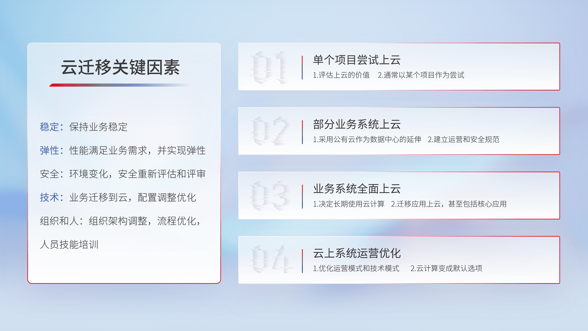 结合实际业务,,,从规划设计、、、云平台选型、、、、云原生改造、、、、数据迁移、、、、集成交付,,,迁移全过程为客户识别最佳上云路径,,,,做好风险识别管理,,,设计网络架构、、、、身份权限、、、安全审计合规、、、、操作审计、、日志审计、、、、监控告警策略、、、多站点容灾设计等,,对云上基础设施进行整体规划,,,,提升IT治理水平,,以满足弹性、、、高可用、、、高性能的需求。。